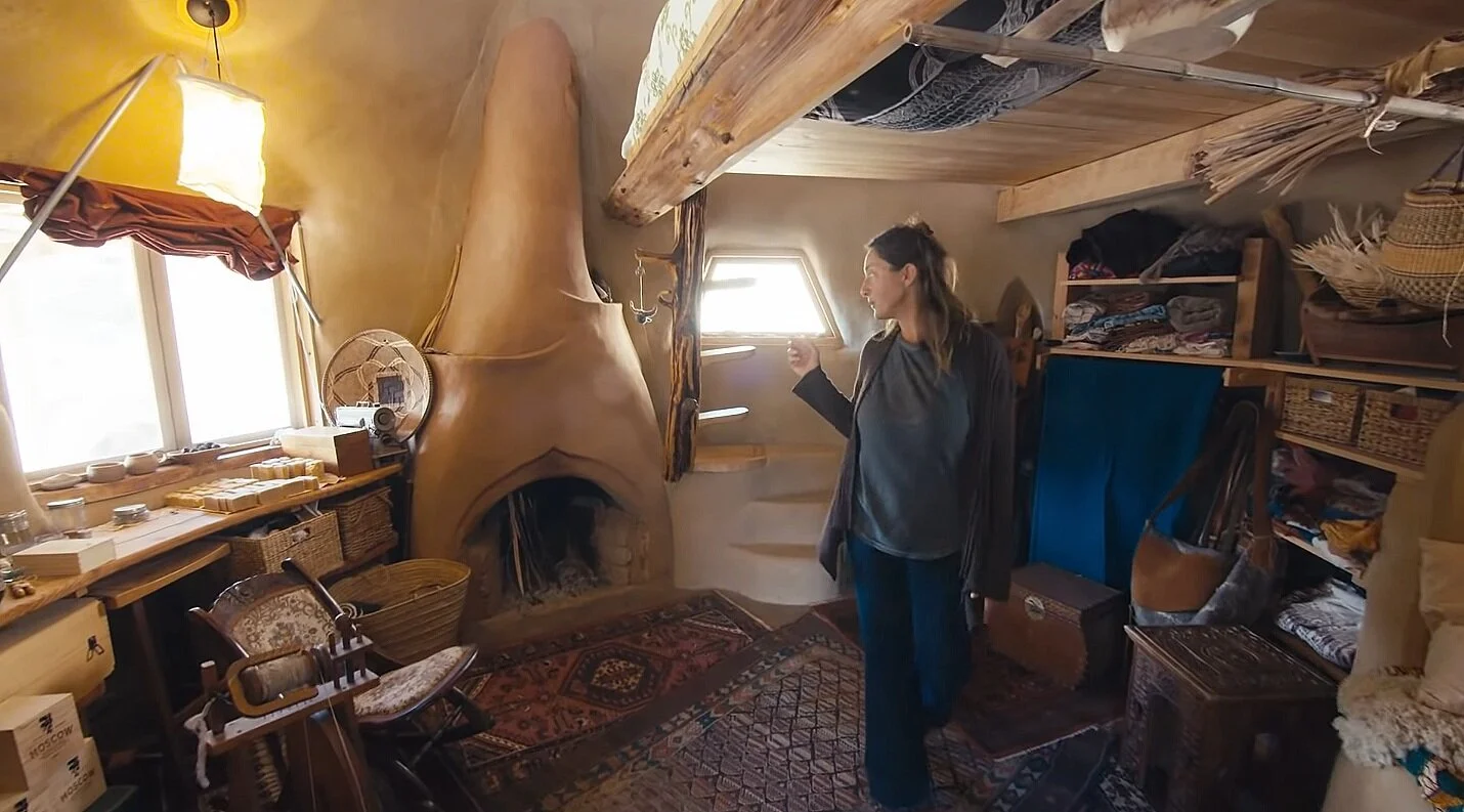 Jane Smith and her husband also moved out to Quail Springs in 2008, after beginning their house in a cob cottage workshop in 2006. It is made out of monolithic adobe and zero concrete. In terms of materials, the house cost them 6K dollars, 4K of which went into the purchase of the wood for the roof and into the blue jean insulation. “This has been the most nourishing space I’ve ever been in '', Jane says. “I feel like I’m living in a little piece of art!”.